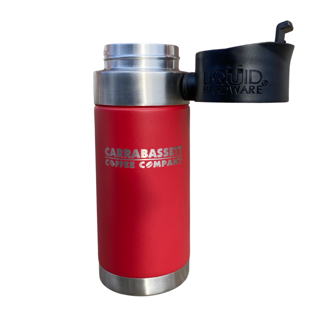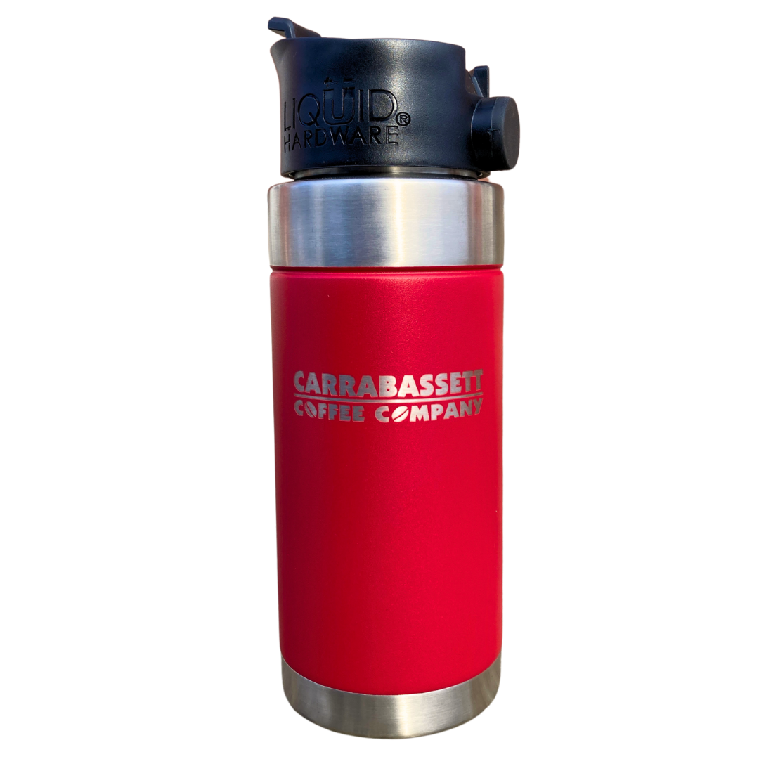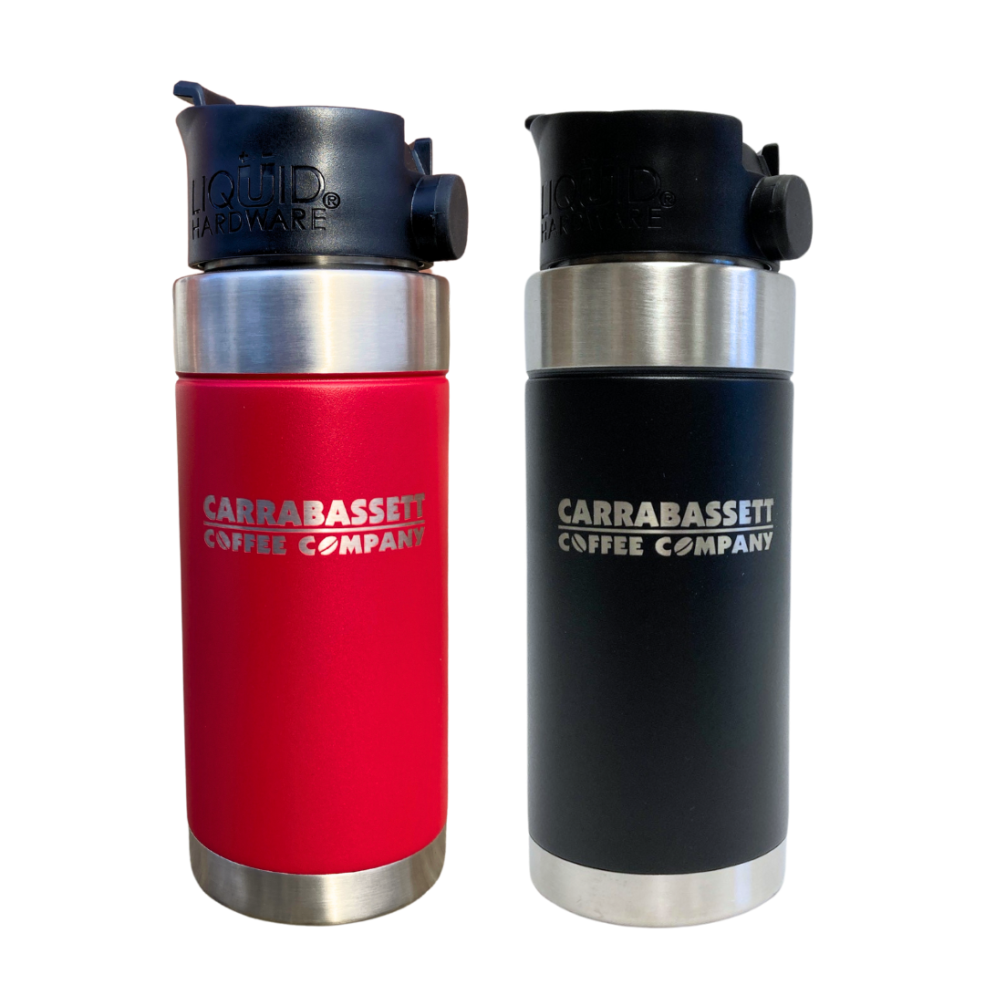 16oz BPA free vacuum insulated double wall stainless steel travel mug. Available in Black and Red.
